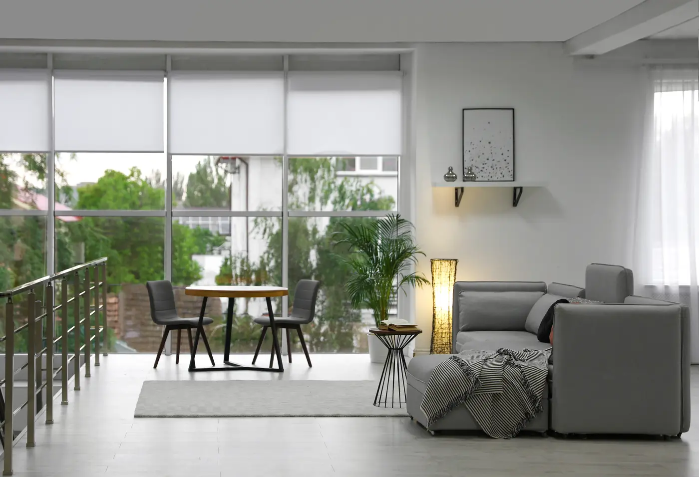 Schedule your free in-home consultation today. Our experts will help you find the perfect roller shades for your cozy living room with modern furniture.